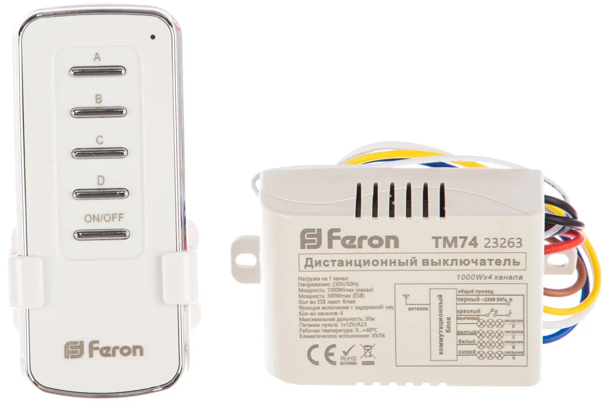 Выключатель бытовой 230V 1000W 4-хканальный 30м с пультом управления , TM74