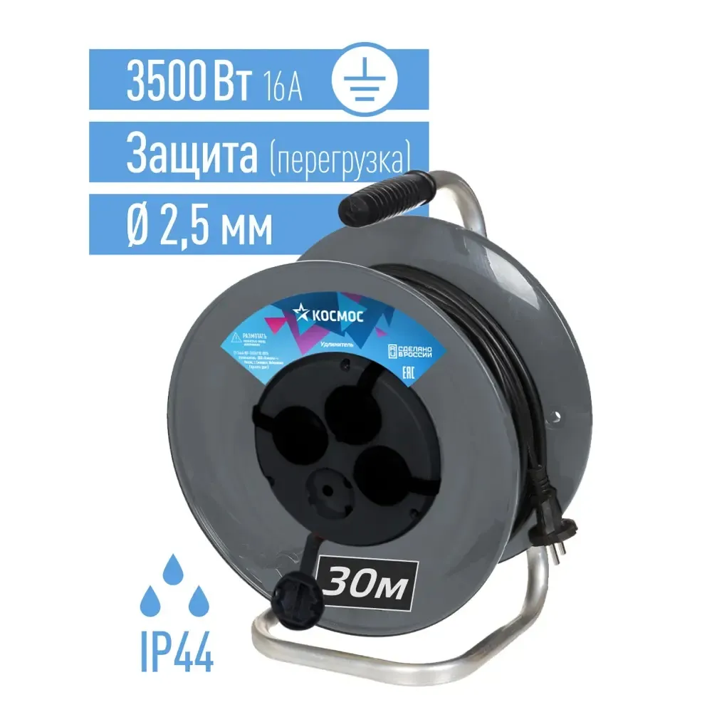 Удлинитель на катушке с/з 16А 4 гн ПВС 3*2,5 30м IP44 КОСМОС